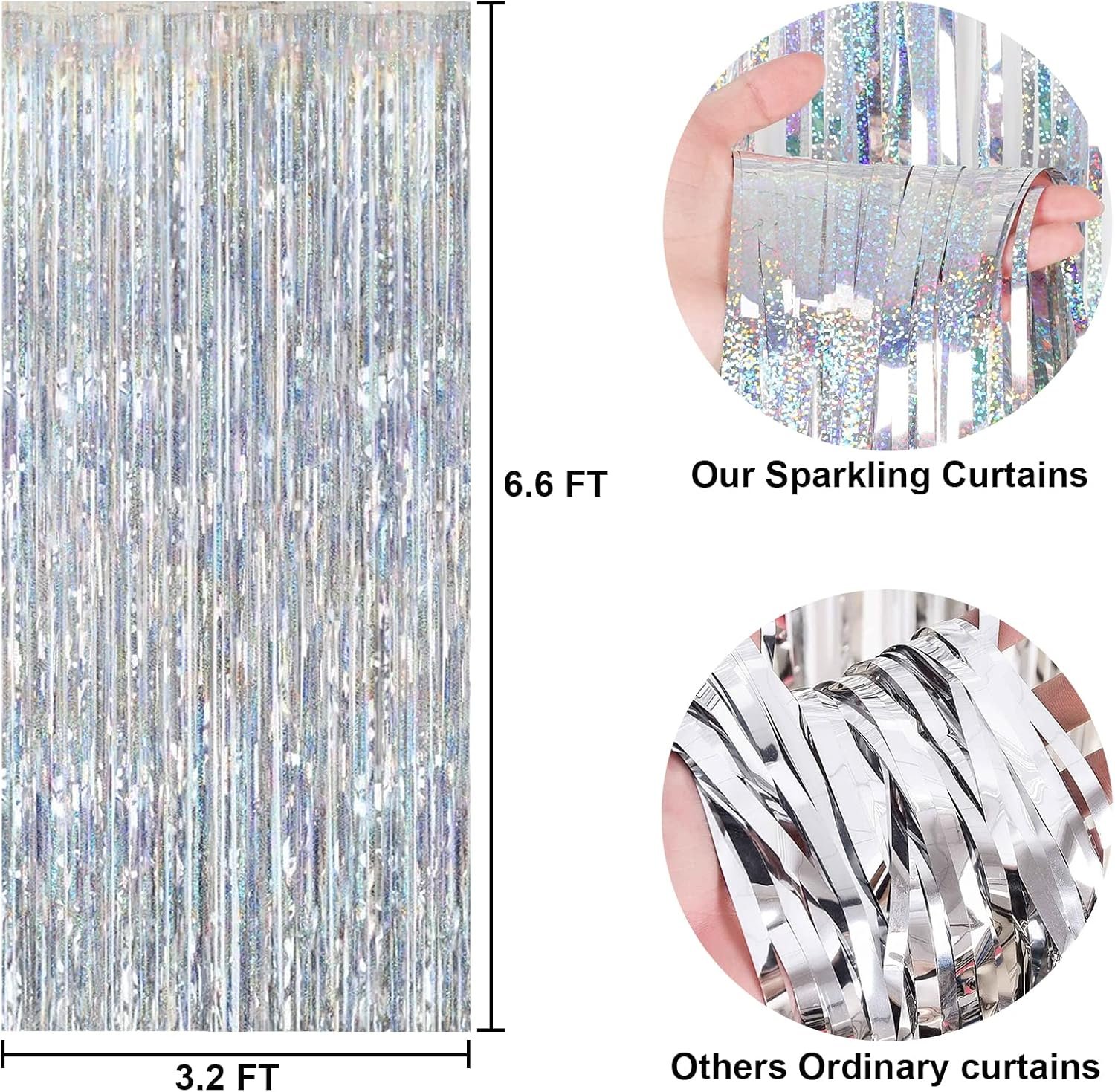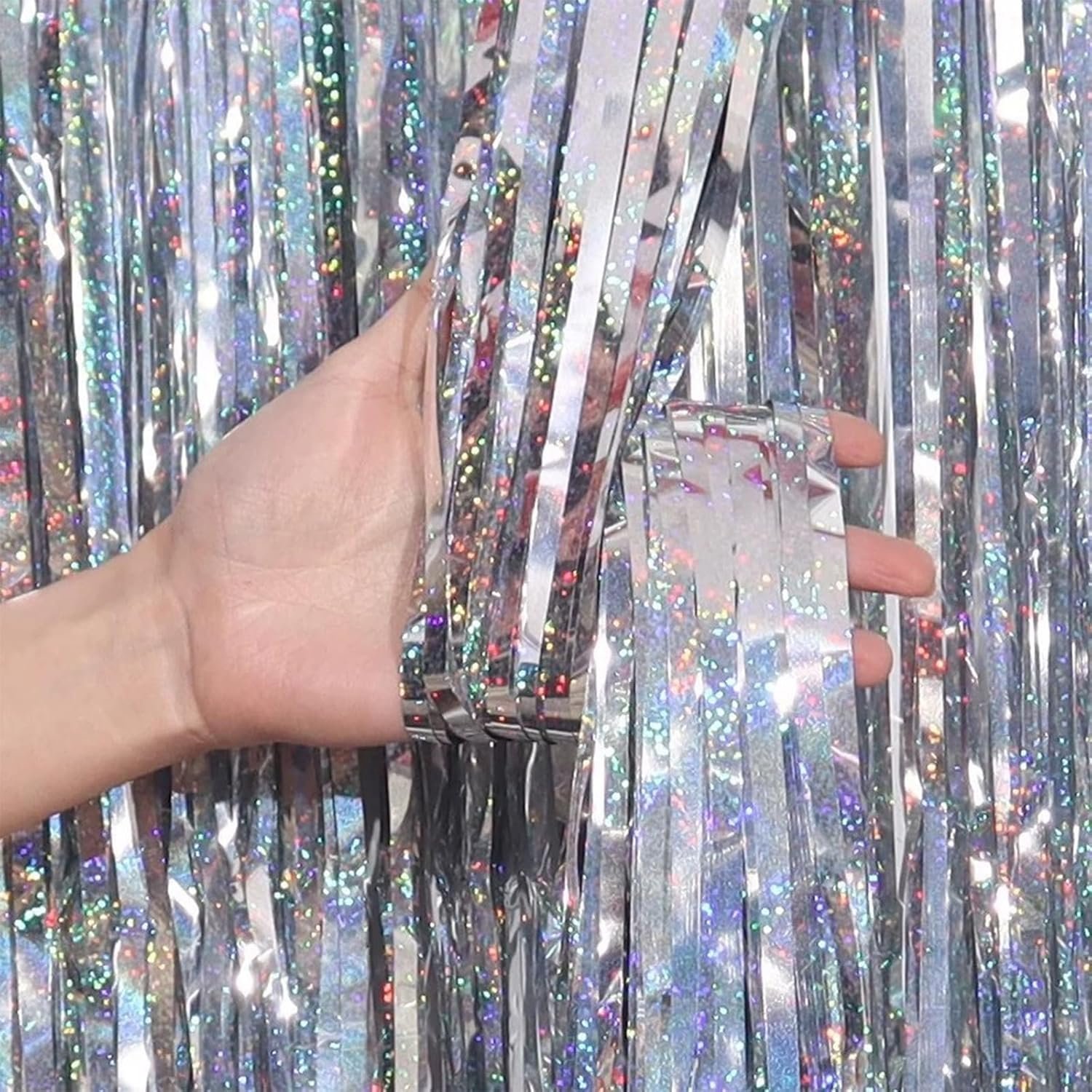 Apportez une touche brillante et festive à vos événements avec ces rideaux à franges métalliques argentés aux reflets holographiques multicolores. Parfaits pour créer un fond photo, décorer un mur ou sublimer une entrée, ils captent la lumière pour un effet spectaculaire.