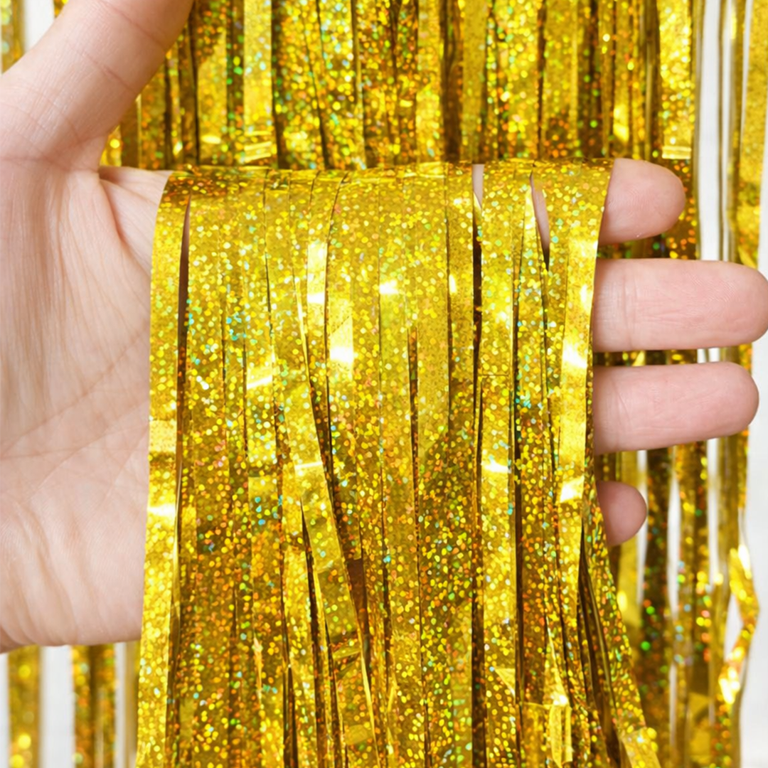 Apportez une touche brillante et festive à vos événements avec ces rideaux à franges métalliques dorées aux reflets holographiques multicolores. Parfaits pour créer un fond photo, décorer un mur ou sublimer une entrée, ils captent la lumière pour un effet spectaculaire.