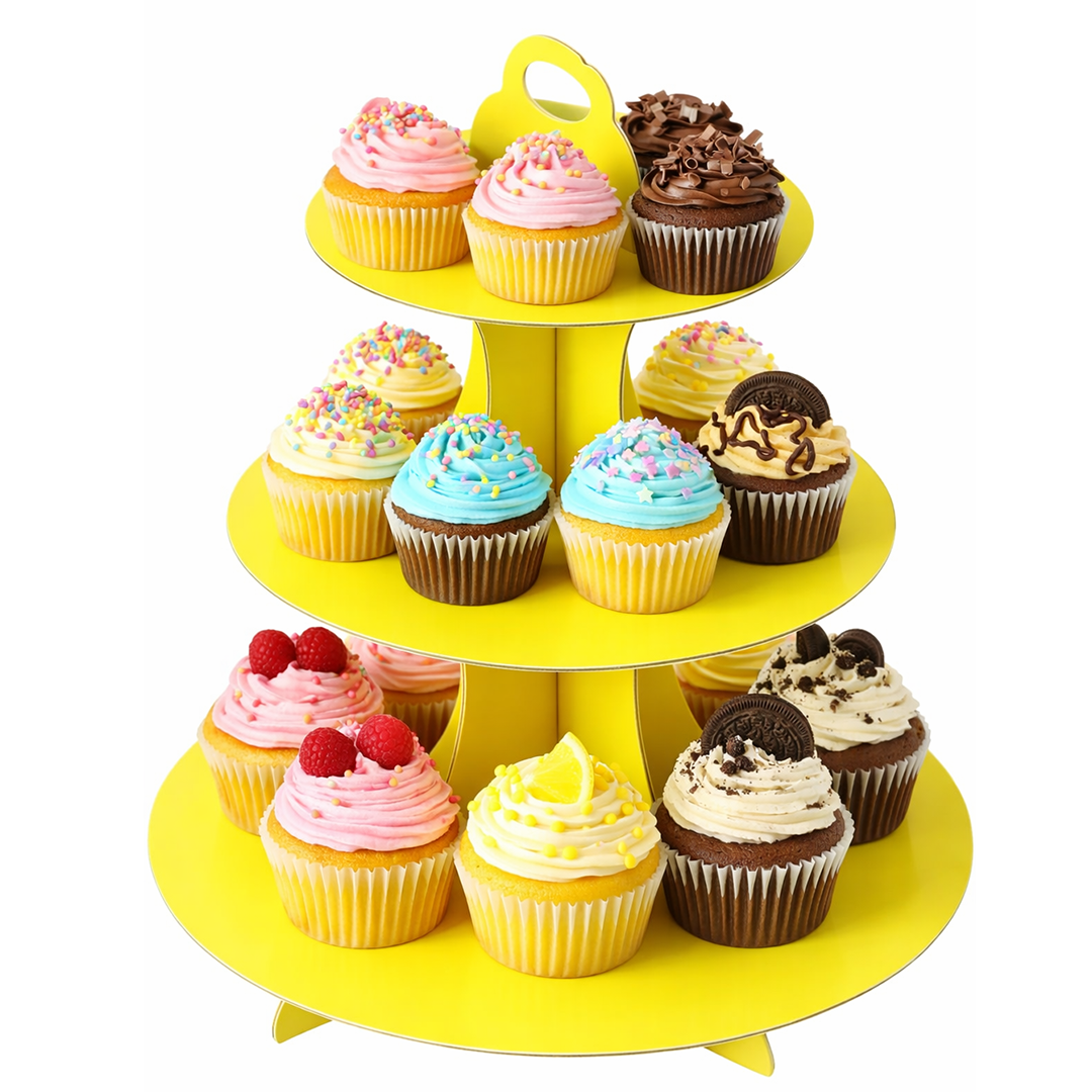 Mettez en valeur vos douceurs avec ce présentoir jaune à étages, idéal pour sublimer vos cupcakes, gâteaux ou friandises lors de vos événements.