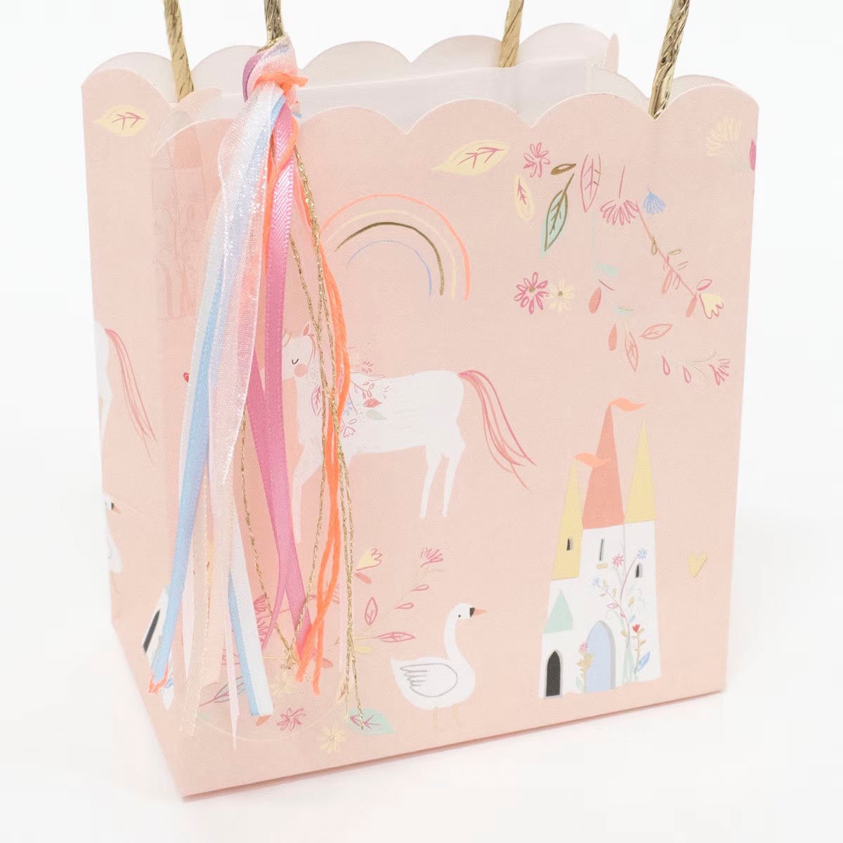 Les petites princesses et princes seront peut-être tristes que la fête se termine, mais ravis de repartir avec l’un de ces magnifiques sacs remplis de surprises ! Décorés de licornes, de châteaux et de cygnes, avec un joli pompon, un bord festonné et une anse dorée, ils apportent une touche finale magique à votre fête.